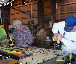 Andy and Kent are fastening the rails to the ties in the fixture.